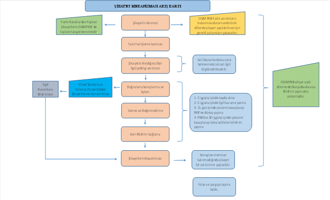 Her türlü şikâyet kanalından, isimli ya da isimsiz yapılan tüm başvurular kabul edilecektir. Projenin sorumlu tarafı Orman Genel Müdürlüğü-OGM ve Proje Uygulama Birimi-PUB şikâyet kutularında biriken talepleri haftalık olarak OGM Proje Koordinasyon Birimi’ne (PKB) iletecektir. Belirtilen sürelerde sorunların şikâyetin çözümlenememesi/talebin karşılanamaması durumunda üst ilgiliye bildirilmesi gerekmektedir.